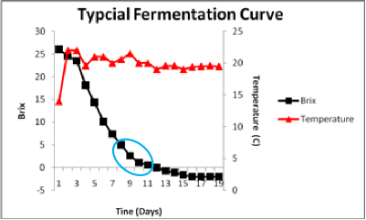 The first step in identification of the cause of a decrease in fermentation rate is a thorough understanding of the characteristics of a normal fermentation profile. The figure displays a typical Brix fermentation curve for the commercial strain Cote des Blancs in Grenache noir must harvested at 26 Brix.